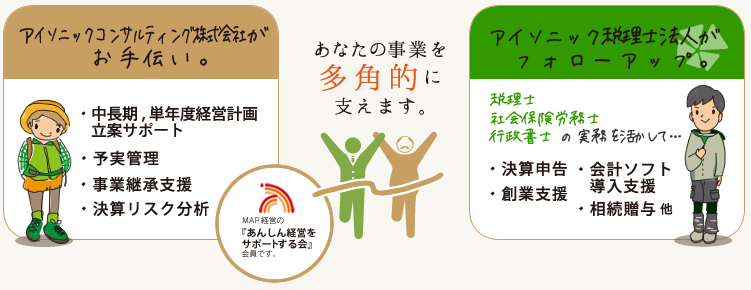 税理士、社会保険労務士、行政書士の資格をもち、豊富な実務経験と蓄積したノウハウをもつアイソニック税理士法人(旧 税理士西山秀一事務所)がフォローアップし、税務・会計・労務・保険・資格申請手続きといった多角的な視点からあなたの会社を支えることが可能です。